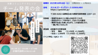 案内 【ご案内】2025/10/18 チーム発表会「大人の学びは、出会いから始まる」 @御代田町 GOKALABO みなさん、こんにちは! 浅麓コミュニティカレッジ 発起人の坂本那香子です。 この秋、浅麓コミュニティカレッジでは「チーム発表の会」を開催します。各プロジェクトの仲間たちが、これまでの活動やこれから挑戦したいことを紹介し、参加者のみなさんと一... 2025.10.04 Topics御代田町案内